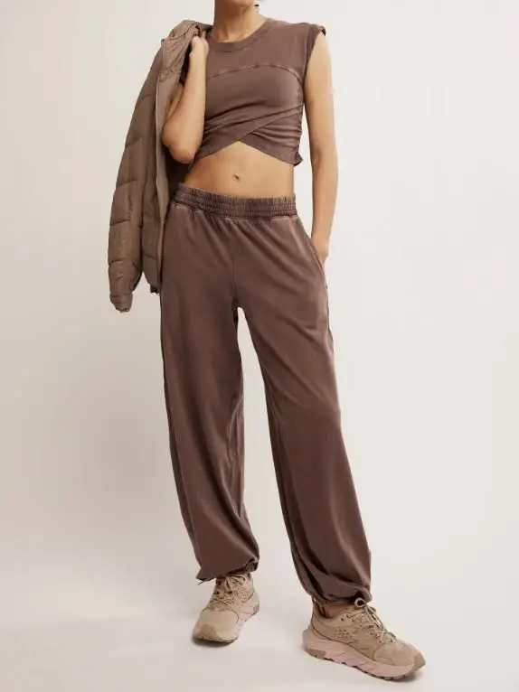 Features: Soft, jersey fabrication; relaxed fit; cropped muscle tee top with seaming detail; ankle length pant with mid-rise waist and wide leg; elasticated waistband and cuffs; crossover detail on top; ribbed collar; side seam pockets