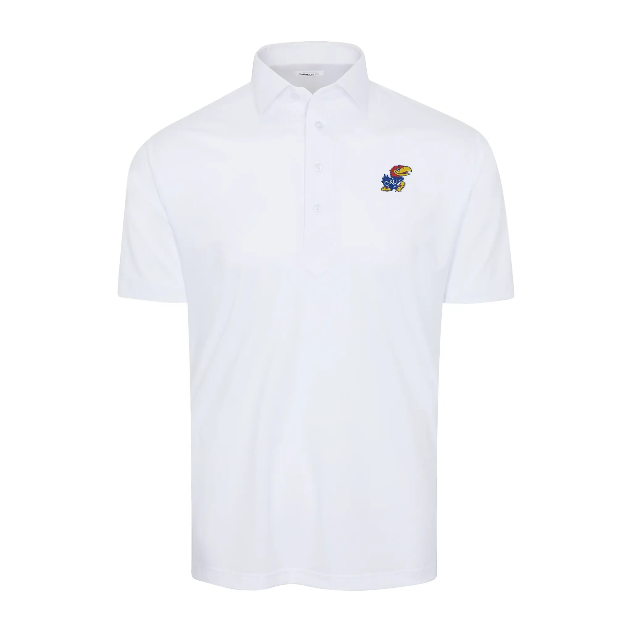 The versatile Semi-Spread Collar Polo. Woven for comfort and designed for style. This shirt pairs a formal semi spread dress collar with an extra comfortable, 4-way stretch, short-sleeved polo. The semi-spread collar has all the benefits of Collars & Co's ever popular English spread collar with a streamlined size and built to accommodate a larger tie knot. Now embroidered with the Kansas Jayhawk.