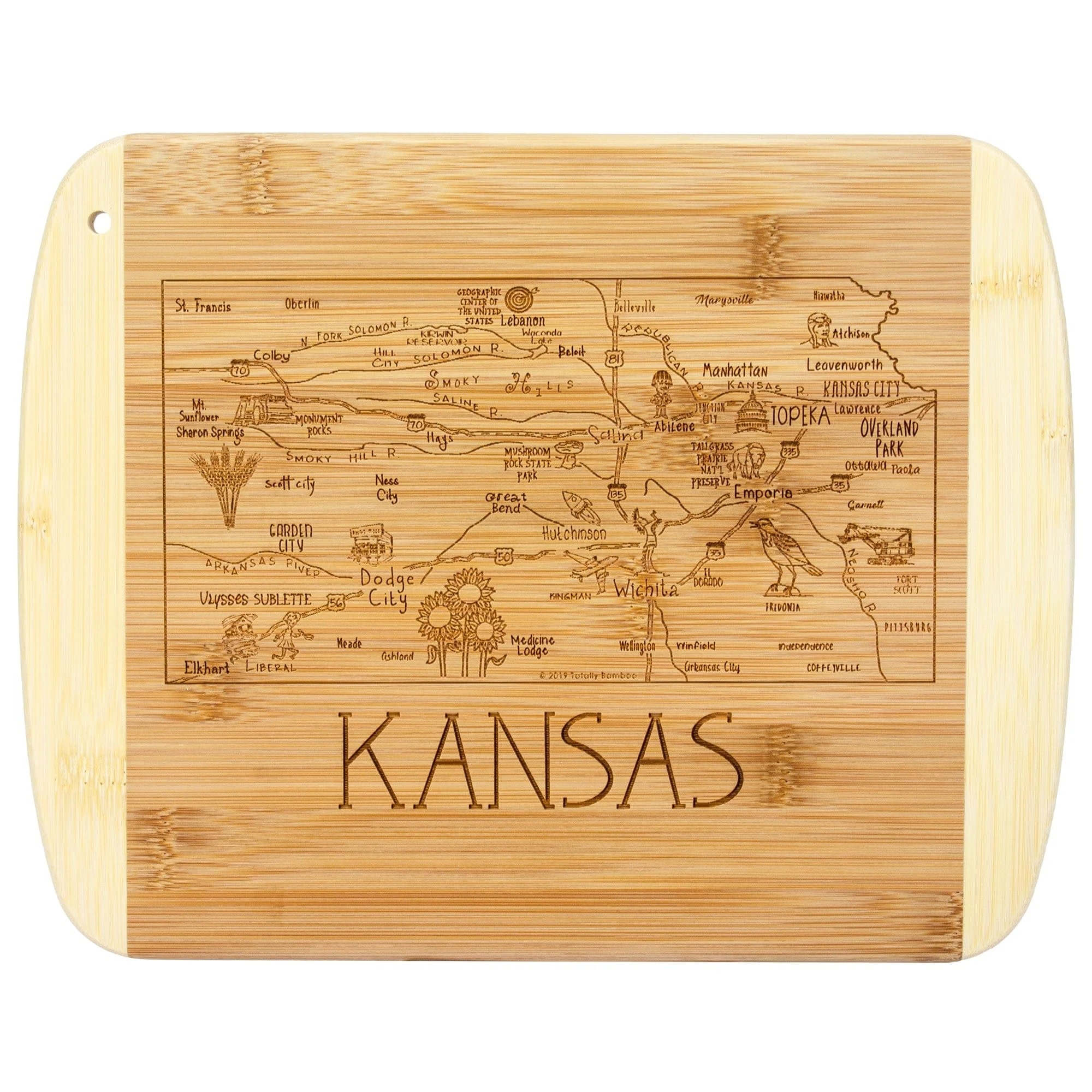 Savor a slice of your favorite state with Totally Bamboo's A Slice of Life Collection! Beautifully crafted from bamboo, this board features fun, laser-engraved artwork of Kansas and showcases all the top cities and landmarks. Serve charcuterie that'll get the conversation started as you and your guests reveal your favorite places with every bite. Flip the board over to its blank side for a knife-friendly bamboo cutting surface perfect for food prep. The Slice of Life Collection makes an excellent gift!